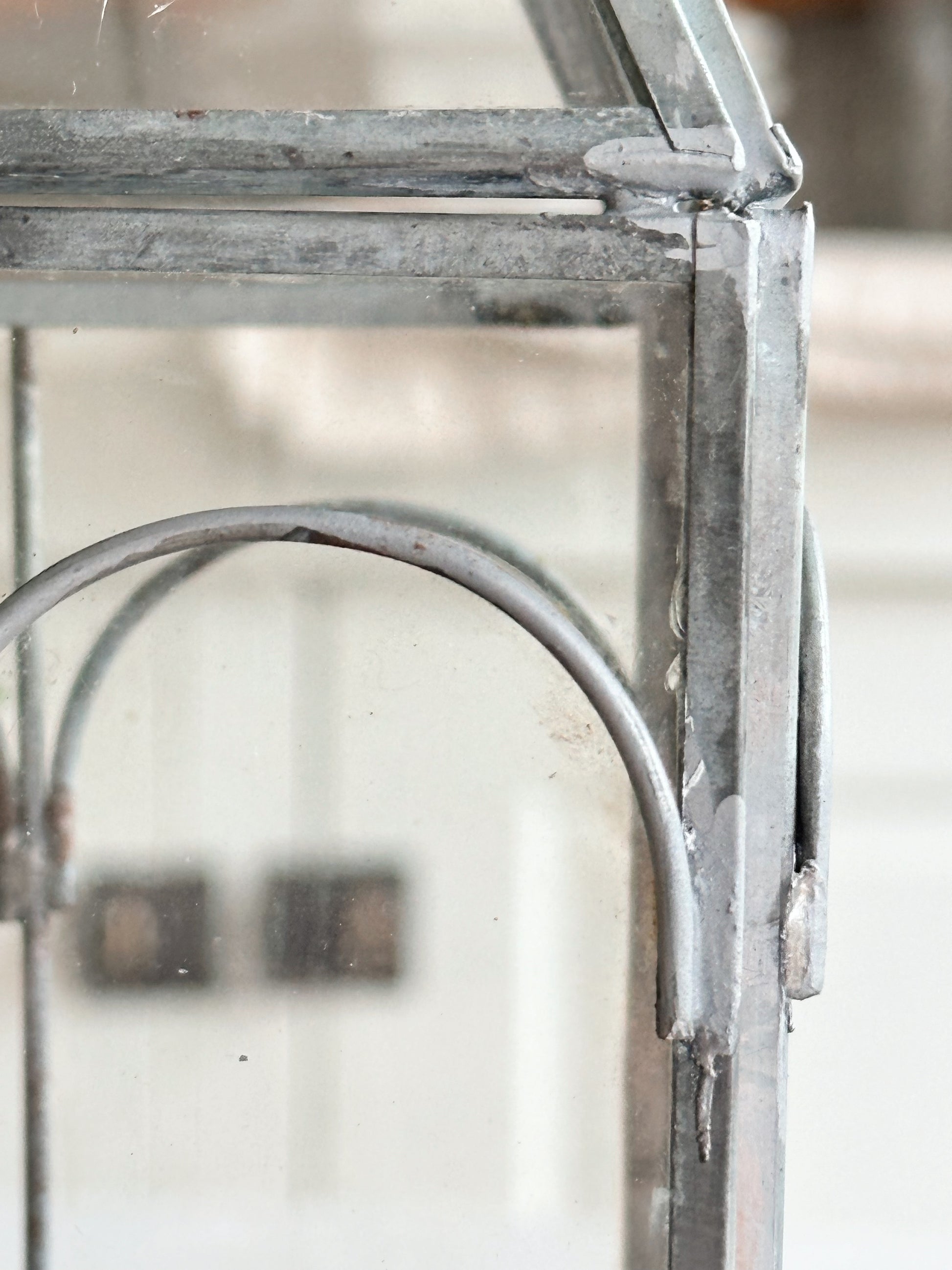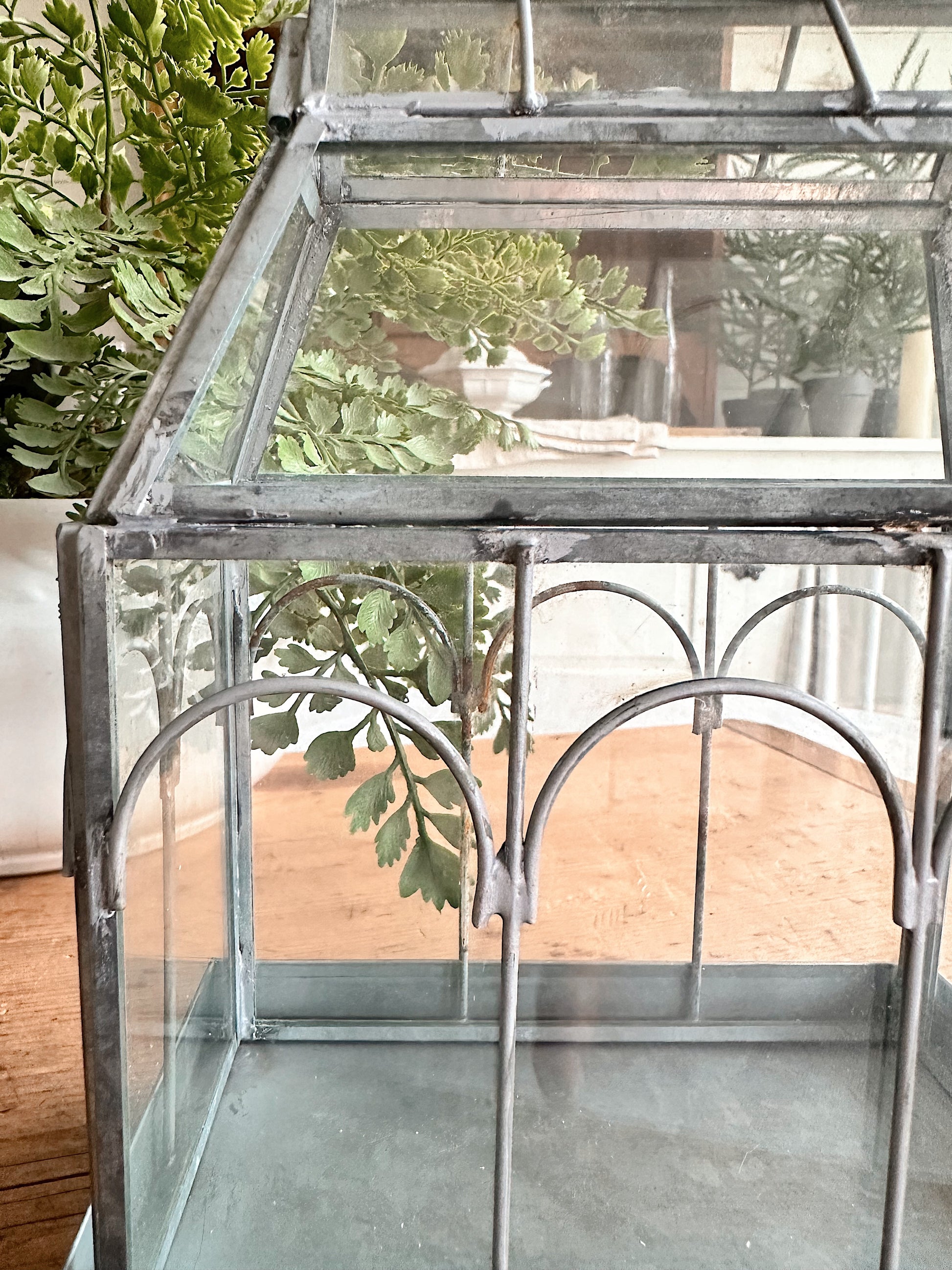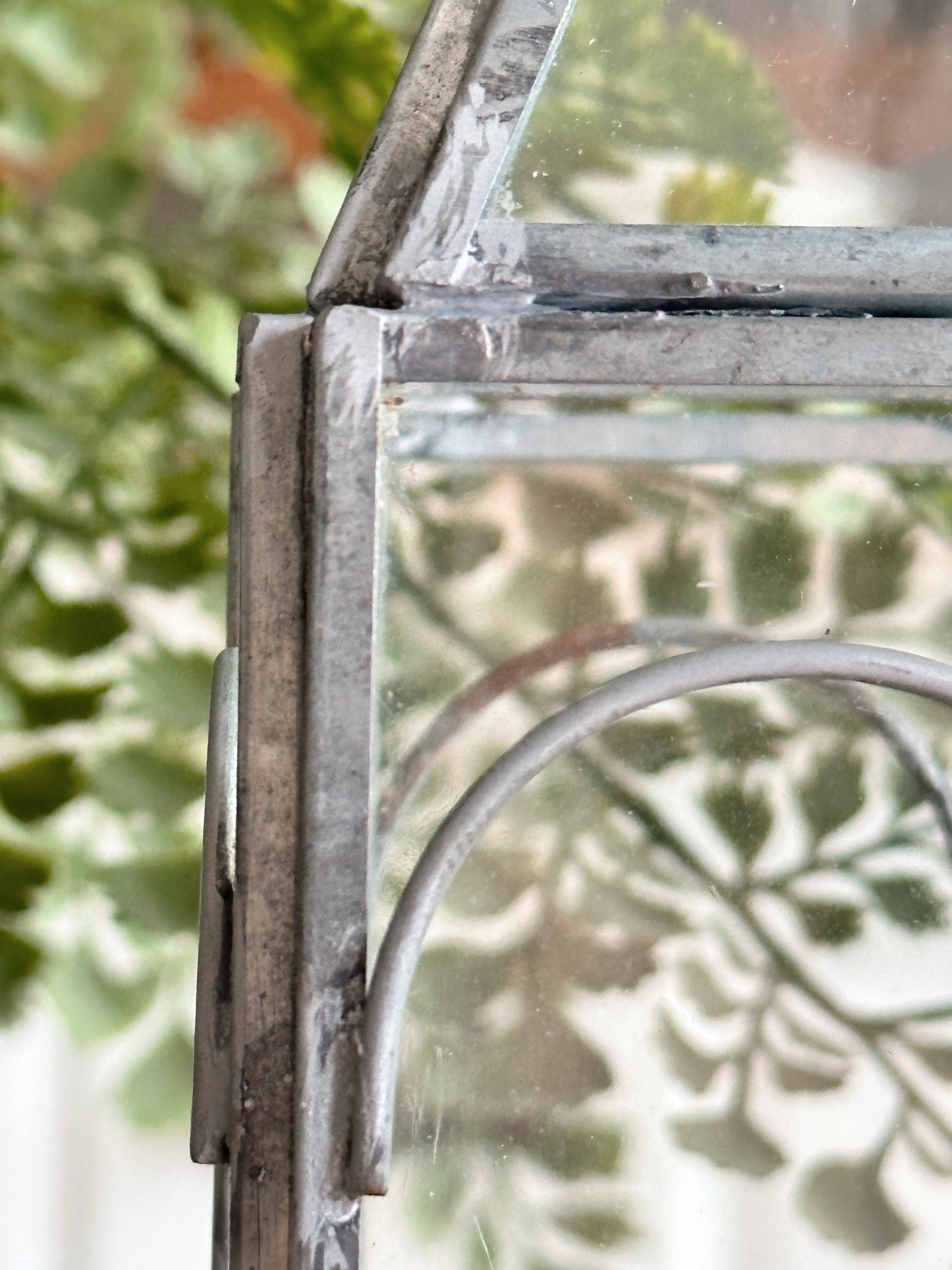- The metal frame on this terrarium has such natural looking patina, you would think it’s old. The little bits of light rust and solder marks give it that time worn look.