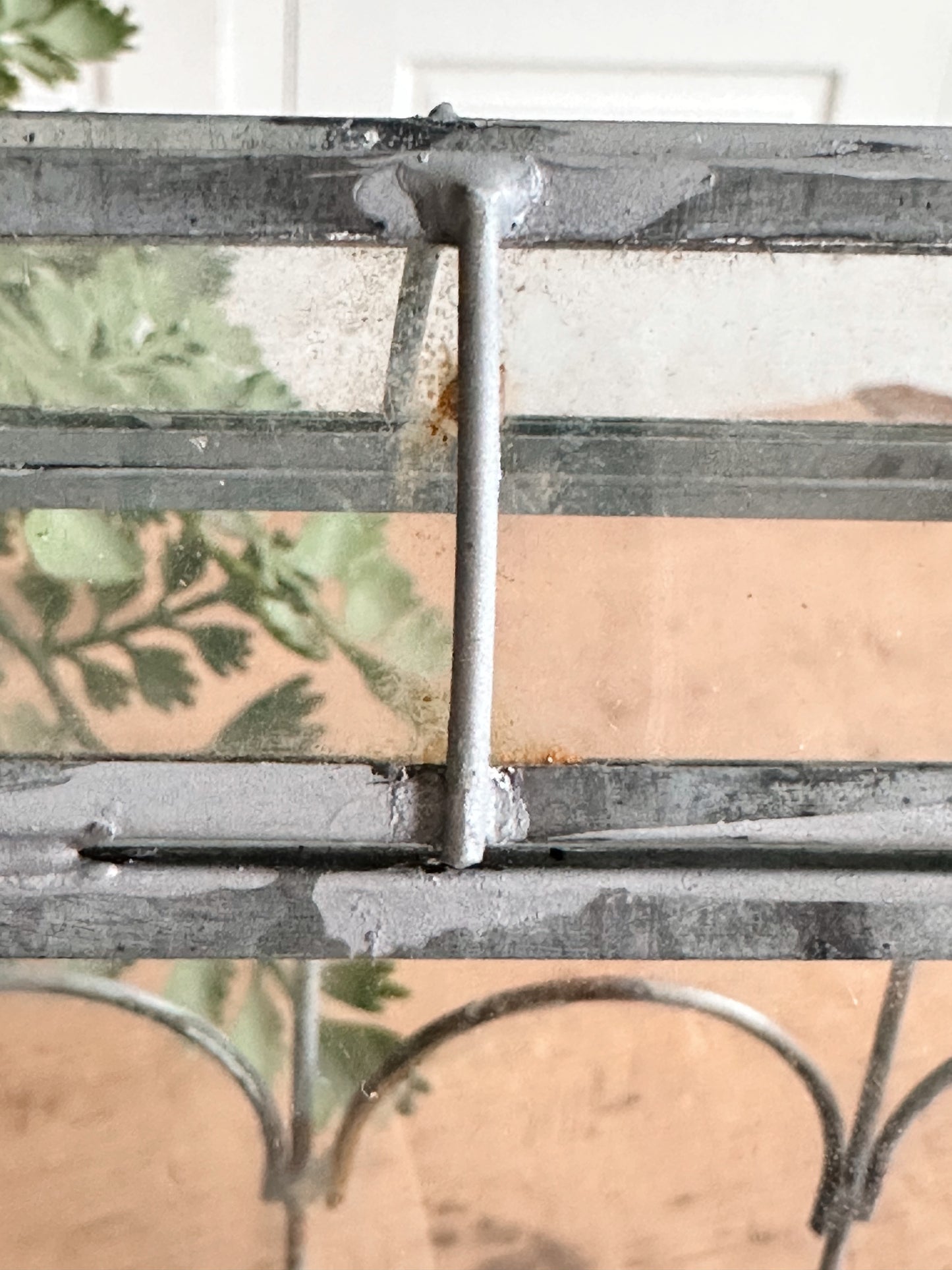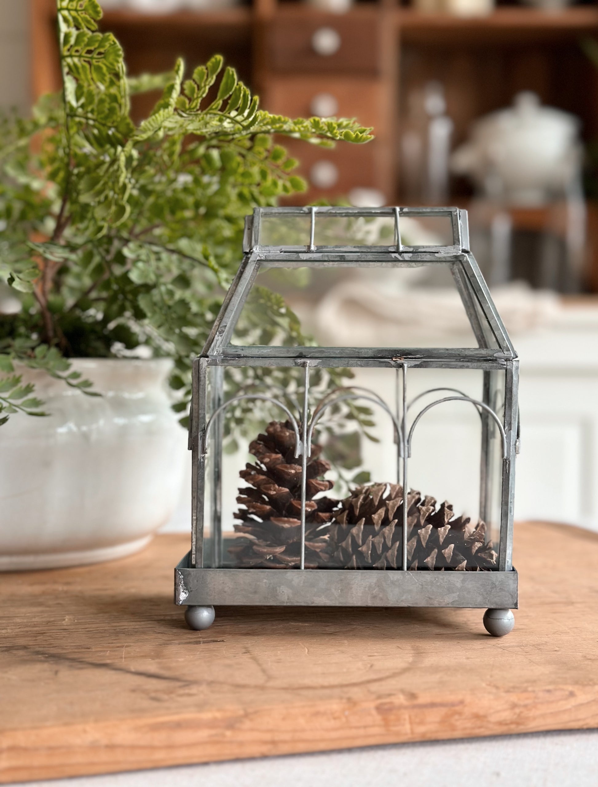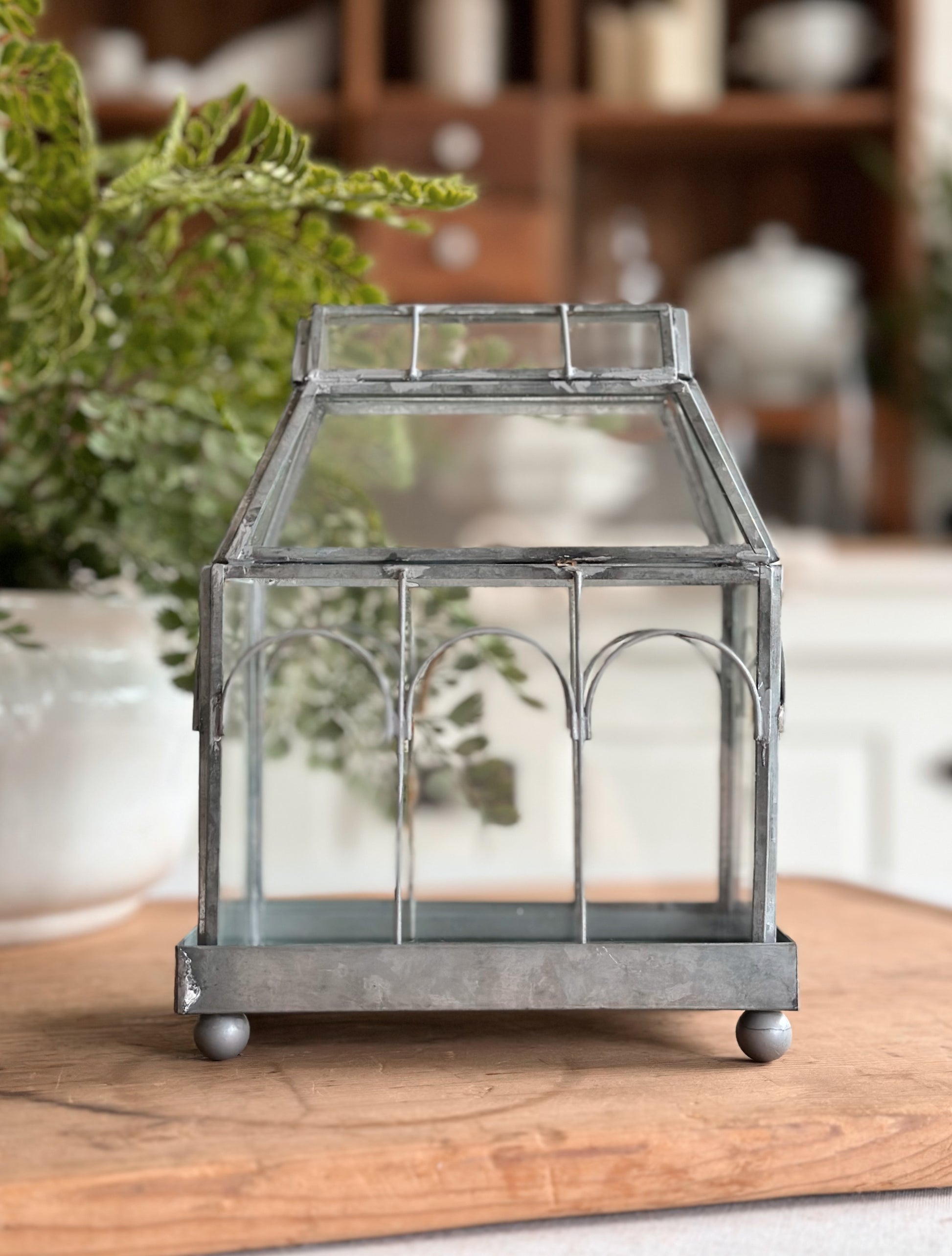 - The metal frame on this terrarium has such natural looking patina, you would think it’s old. The little bits of light rust and solder marks give it that time worn look.