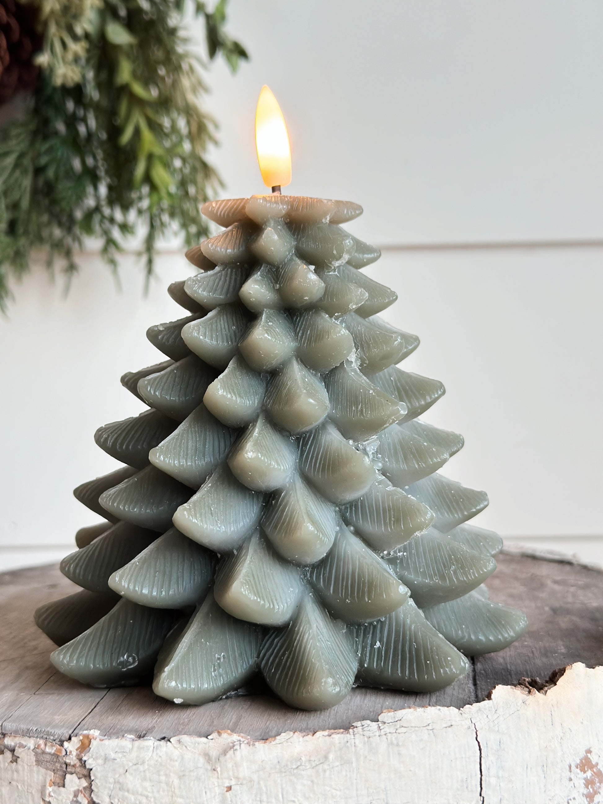 - Wax covered tree with a flickering LED light.
