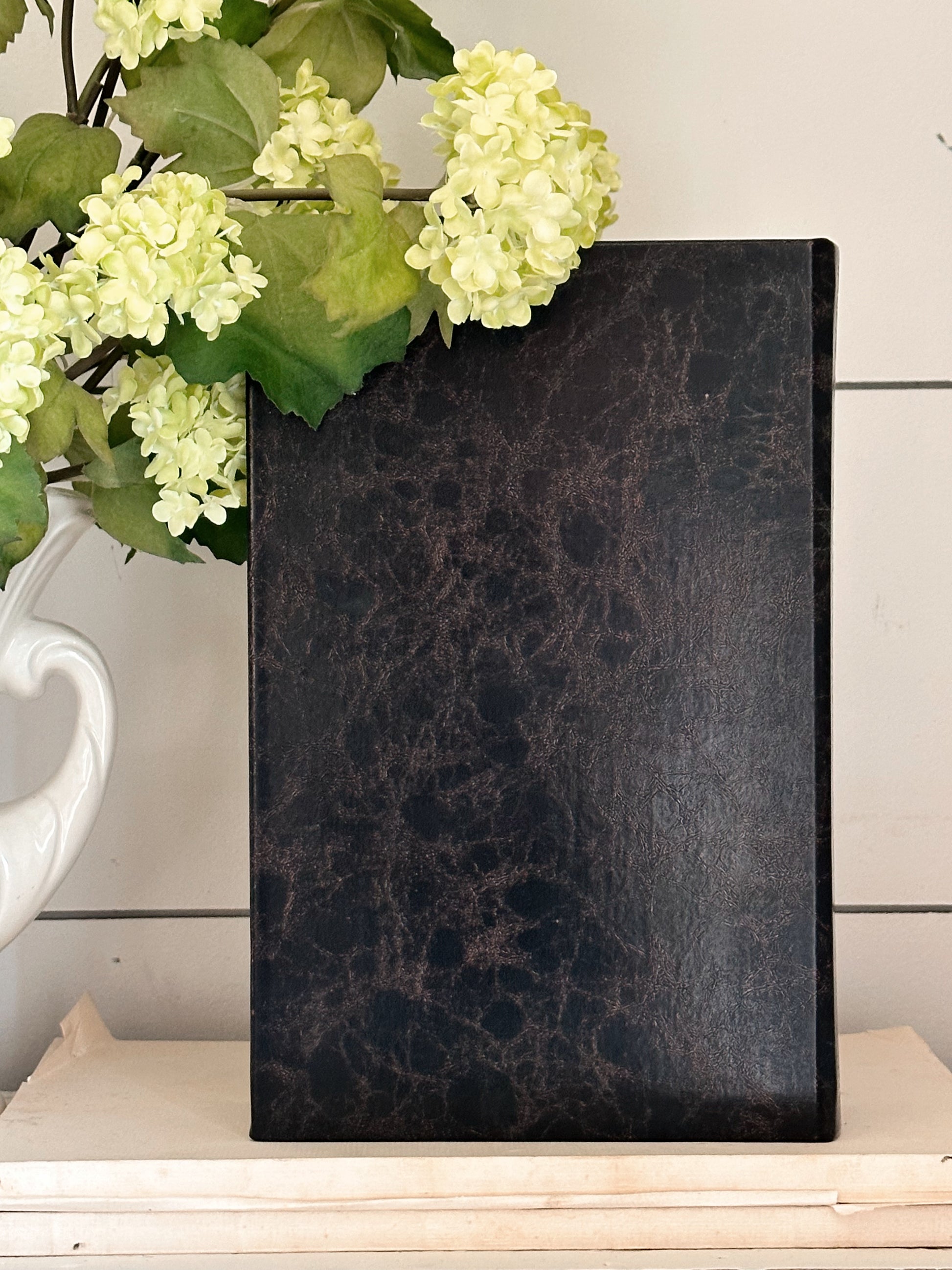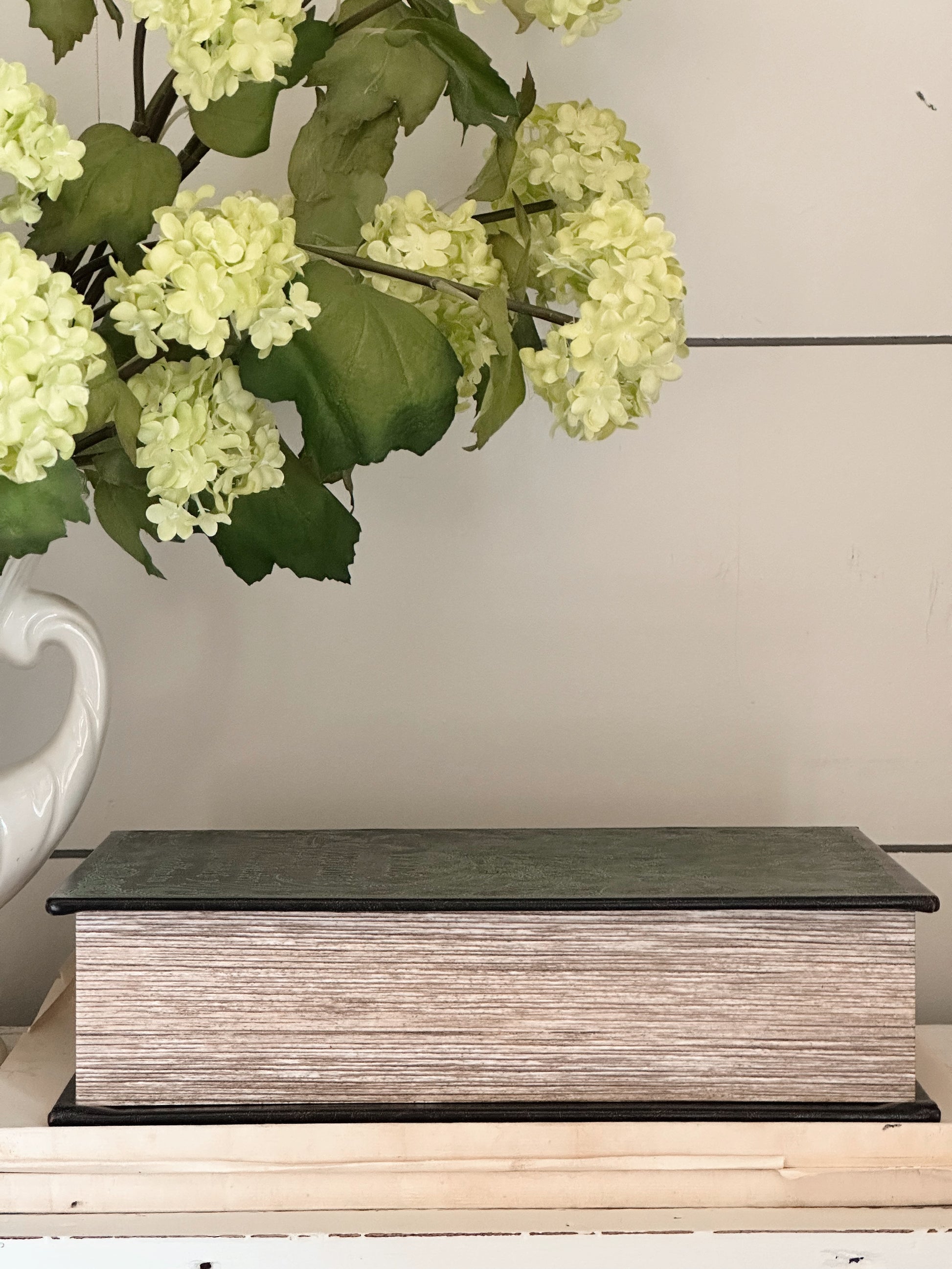 - Each book box is constructed of wood and features a faux leather wrap giving the appearance of a leather bound vintage book
