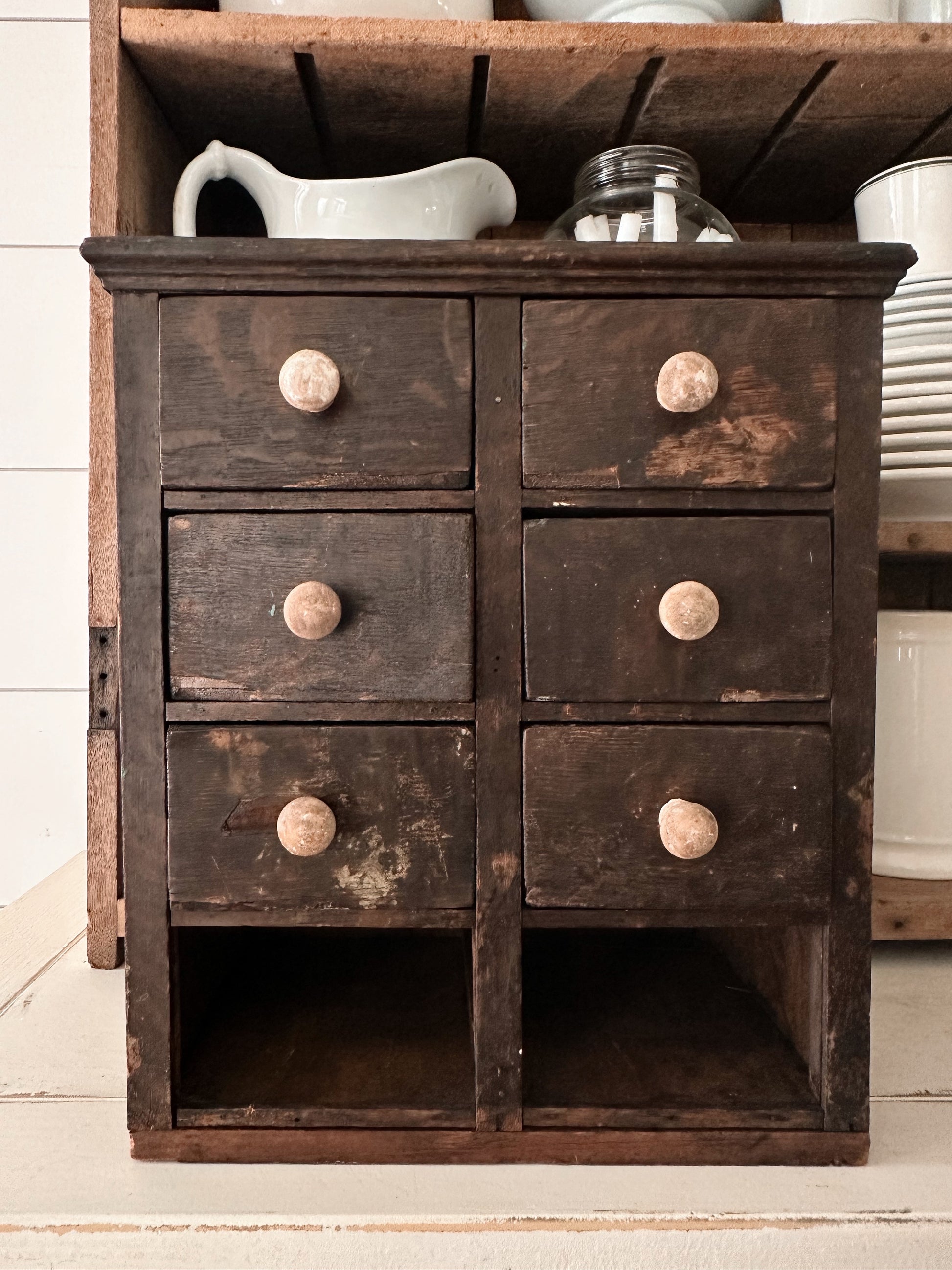 - Six drawers to store your favorite treasures. A couple of the drawers have some imperfections…. see photos