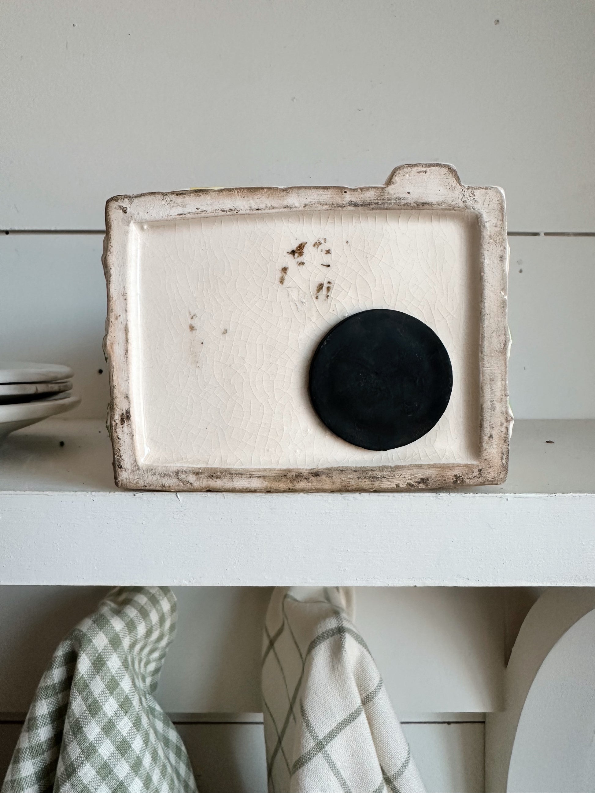- There is what appears to be a deep scratch in the glaze on the back corner (see photos)