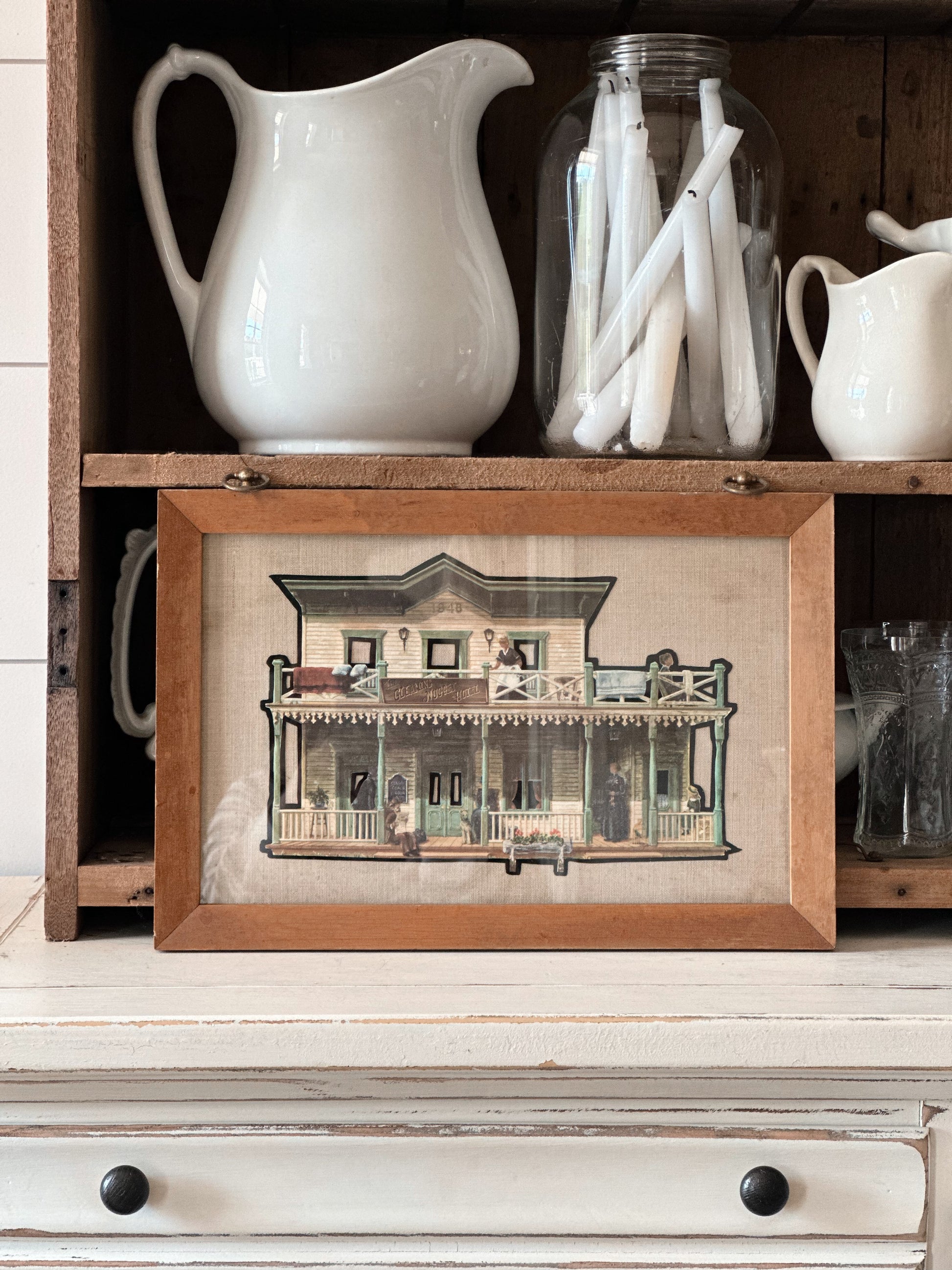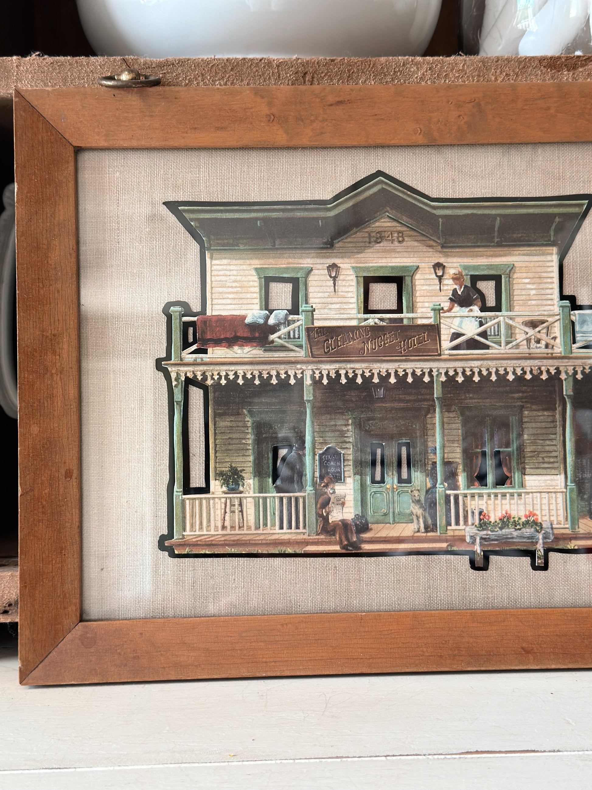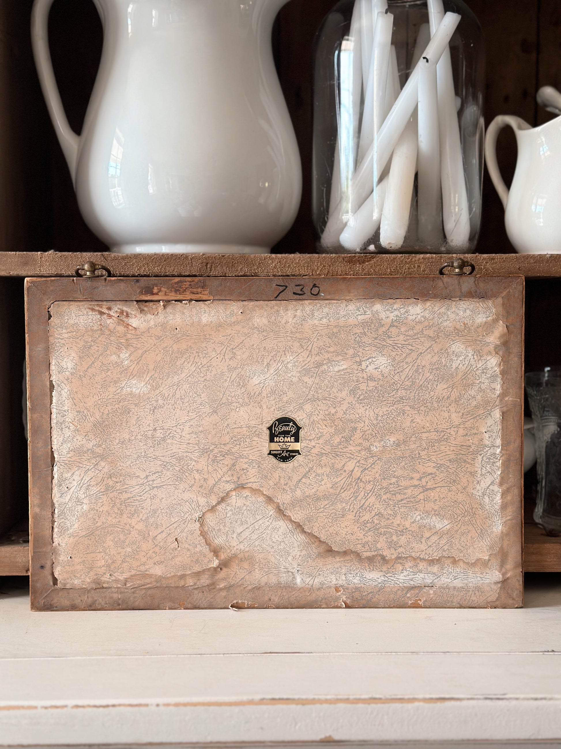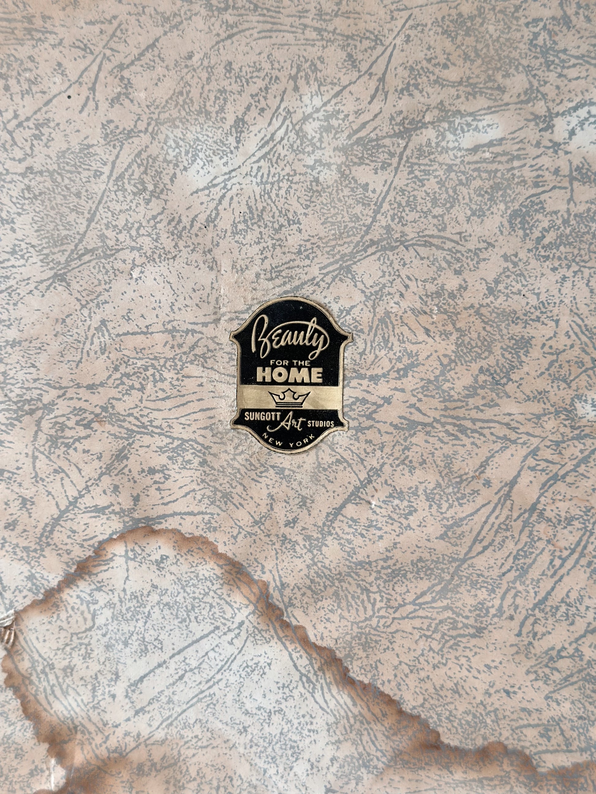 - The artwork appears to be a thick vintage cutout backed in another thick black material and then mounted on a natural linen
