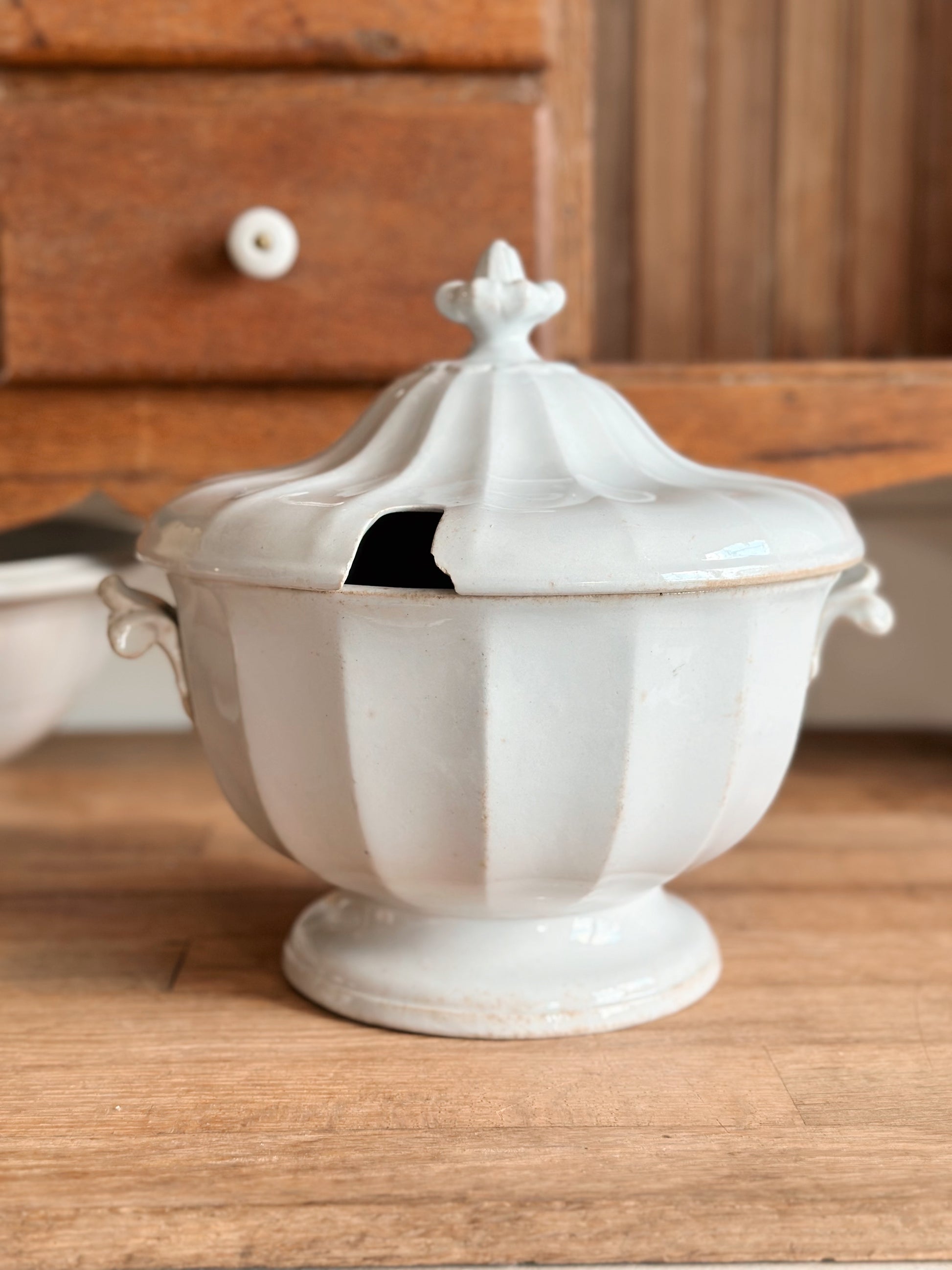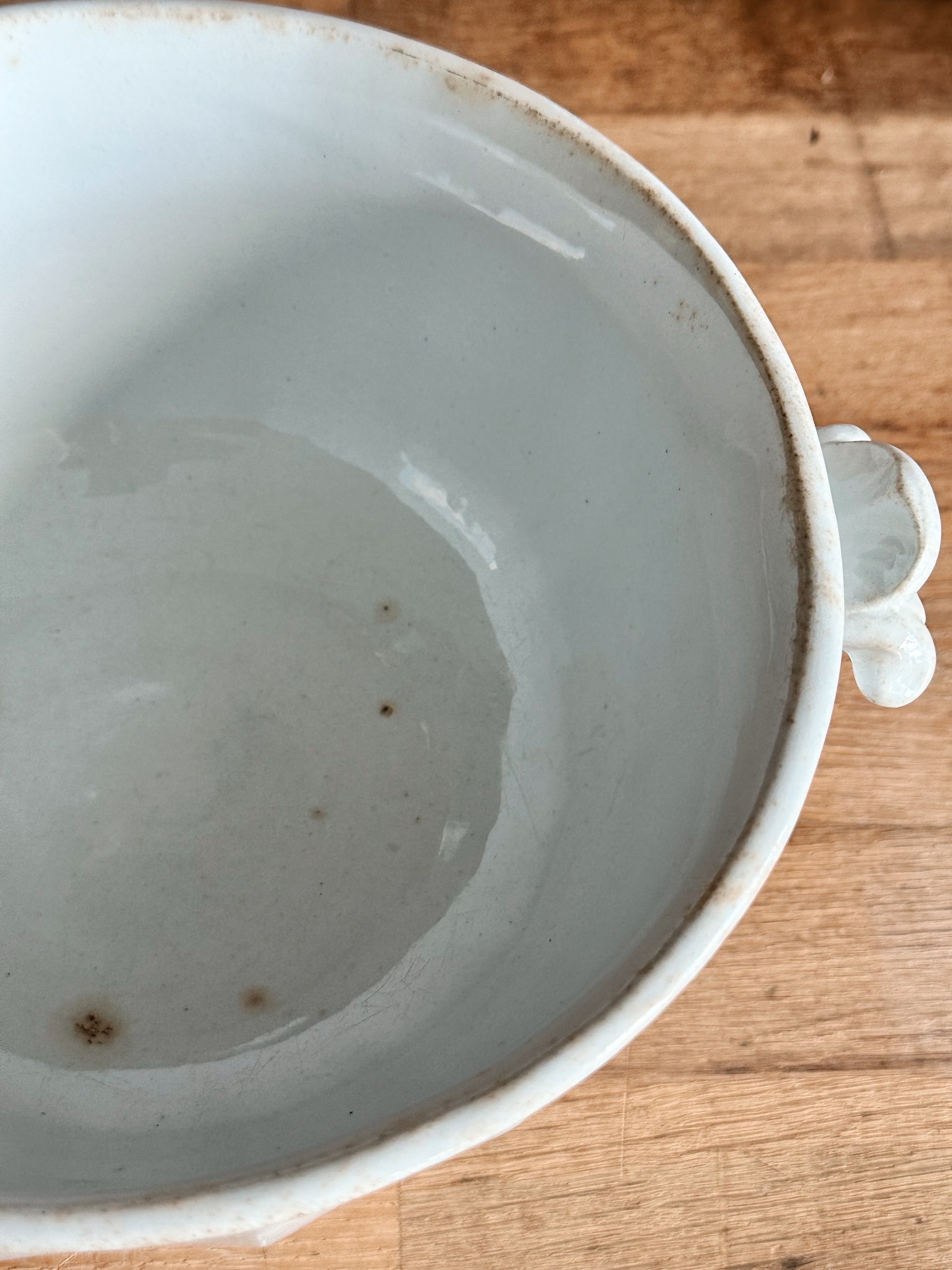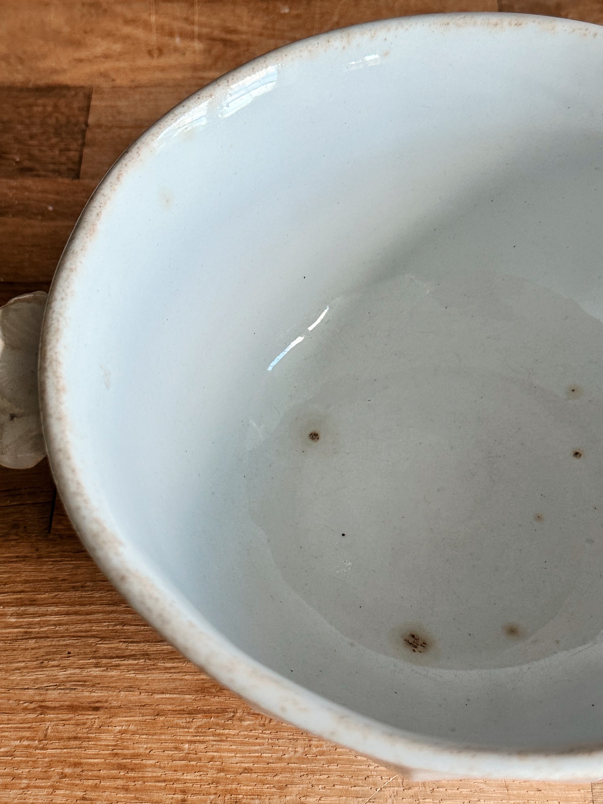 - There is one chip on the underside of the lid near where the ladle would have gone and some flea bites on the inside bottom of the bowl.